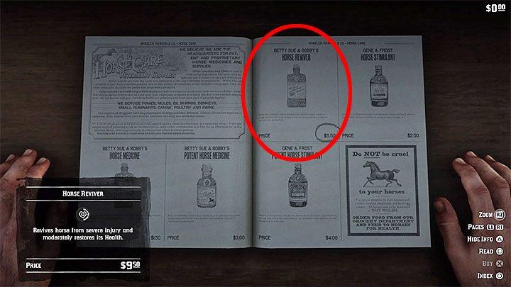 Horse Reviver allows you to heal a heavily wounded horse. Otherwise, the only solution is to kill your animal. Horse Reviver can be purchased at stud farms and general stores – the picture above shows the general store found in Valentine, the first town in the game. One bottle costs around 10 dollars. A small cost considering that you can lose your horse permanently.