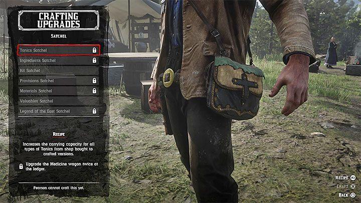 Satchel upgrades are crafted at your gang’s camp by talking to Pearson at the butcher table, and later they can be bought from a Fence after you finish the main story epilogue.