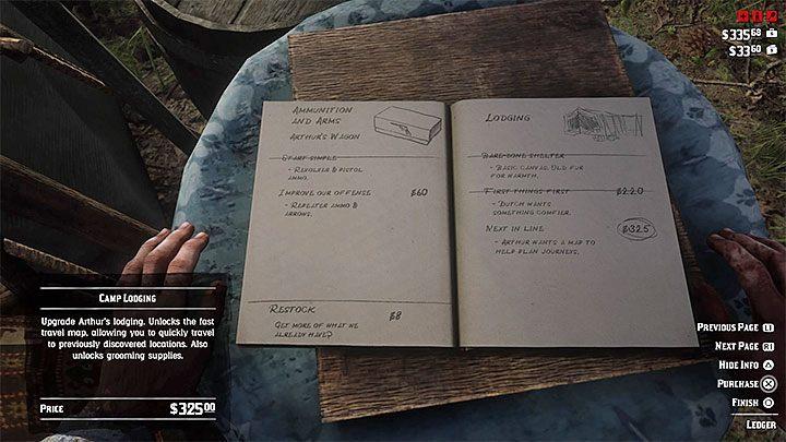 - You should spend your funds primarily on buying further upgrades to the gang camp. The two most important improvements to the camp can be found on the Lodging page in the register – First Things First for $220 and Next in Line for $325. By paying for both of these improvements, you can unlock a fast-travel map in the camp. It will make it much easier for you to continue your gameplay. You will be able to get to important locations more easily without having to travel on horseback for a long time. Use stagecoach or train only if you are far from the gang’s headquarters and if you’re in a hurry – the journey can cost from a few to more than $10.