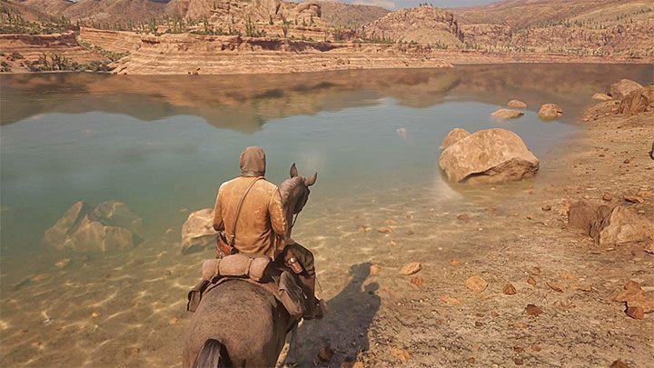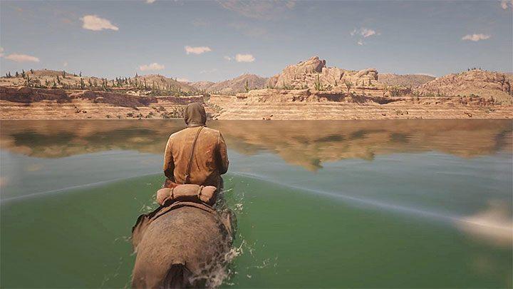 Get on your mount and enter the river. Move towards the shore on the opposite side of the river. The water shouldn’t be deep – your horse should be able to reach the shore. You can also adjust your course, the current isn’t that strong.