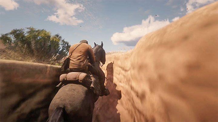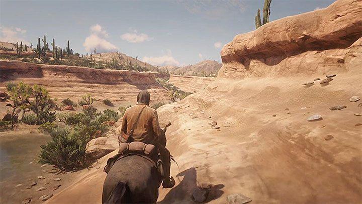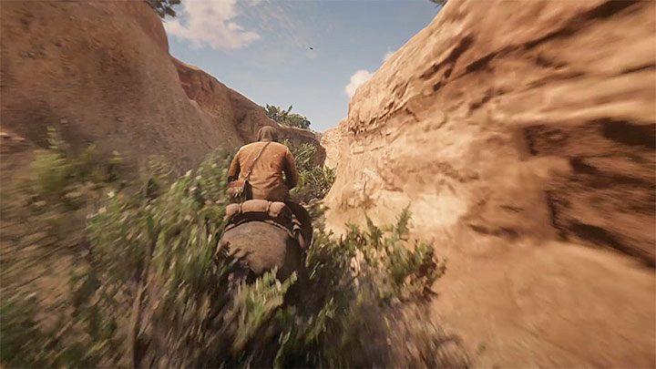 After reaching the place presented in picture 1 (the end of the valley), start galloping and get on the rocks. Press the button to dismount your horse when you reach the highest point (the picture 2).