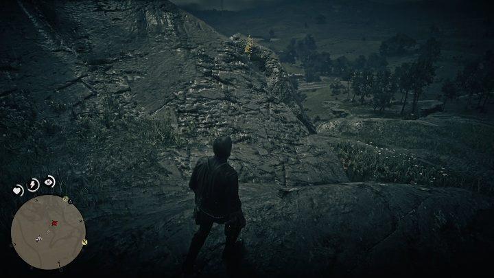 After climbing the mountain, you have to descend slowly and carefully on a rock ledge. The descent to it is located between two small hills.