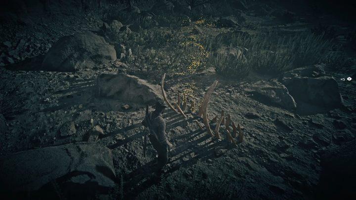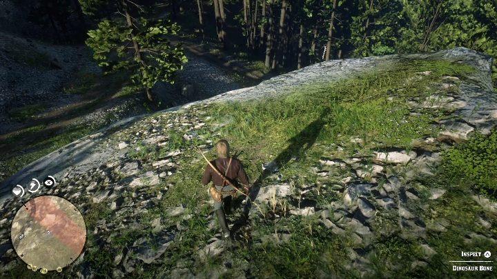 These bones are located between the mountains. Do not jump from above to examine the bone. Go around.